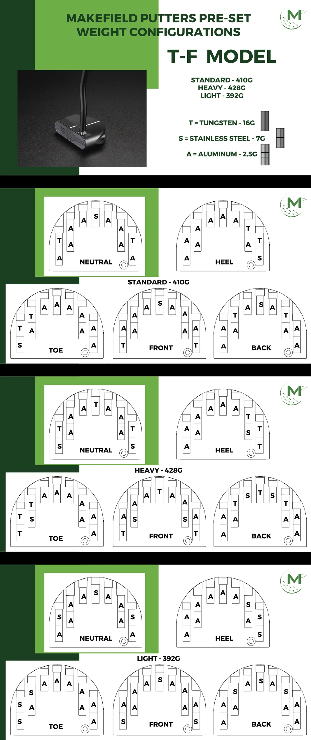 The TF is made of anodized, 6061 T6 Aircraft Grade Aluminum, boasts an unprecedented ability to move weight inside the clubhead allowing the player to adjust the Center of Gravity and the Moment of Inertia. The X-3 Weight system makes it possible to adjust the putter to the player for better results, instead of changing the stroke. The TF Stability Stance Sole helps the putter sit flush and square every time giving the player the best opportunity for a repeatable set up position. Radial Cusp milling technology causes minimized contact points between club and ball resulting in reduced surface friction. The Makefield TF produces a soft but lively feel, with incredible ball roll.
