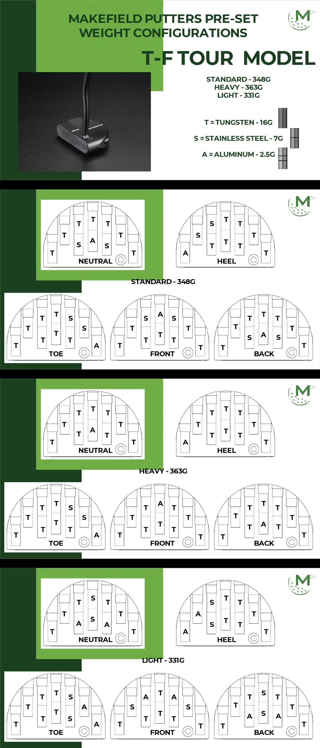 Our smallest model the TF Tour (named after Everett “Tom” Farr Jr.) is designed to improve your game while giving you the best forward ball roll out there. The stock models are ready to ship same day or next and are the go-to if you know you want a Makefield in your hands today!
